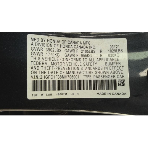 #25159, Used 2021 Honda Civic Parts Car - Gray with black interior, 4cyl engine, automatic transmission (damage=rear)