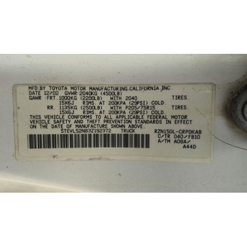 Used 2003 Toyota Tacoma Parts Car - White with gray interior, 4-cylinder engine, Automatic transmission