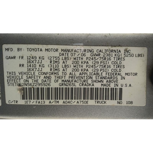 #26032 Used 2006 Toyota Tacoma Parts Car - silver with gray interior, 6-cyl engine, automatic transmission (damage=front & rear)