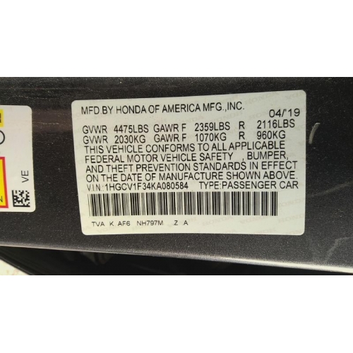 #26038, Used 2019 Honda Accord Parts Car - Gray with black interior, 4cyl engine, automatic transmission (damage=LEFT front)